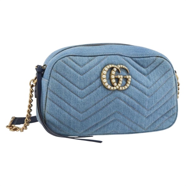 • 【原宿店限定】グッチ GUCCI ショルダーバッグ スモールカメラバッグ GGマーモント デニム ライトブルー ゴールド 447632 レディース ka1639SAV